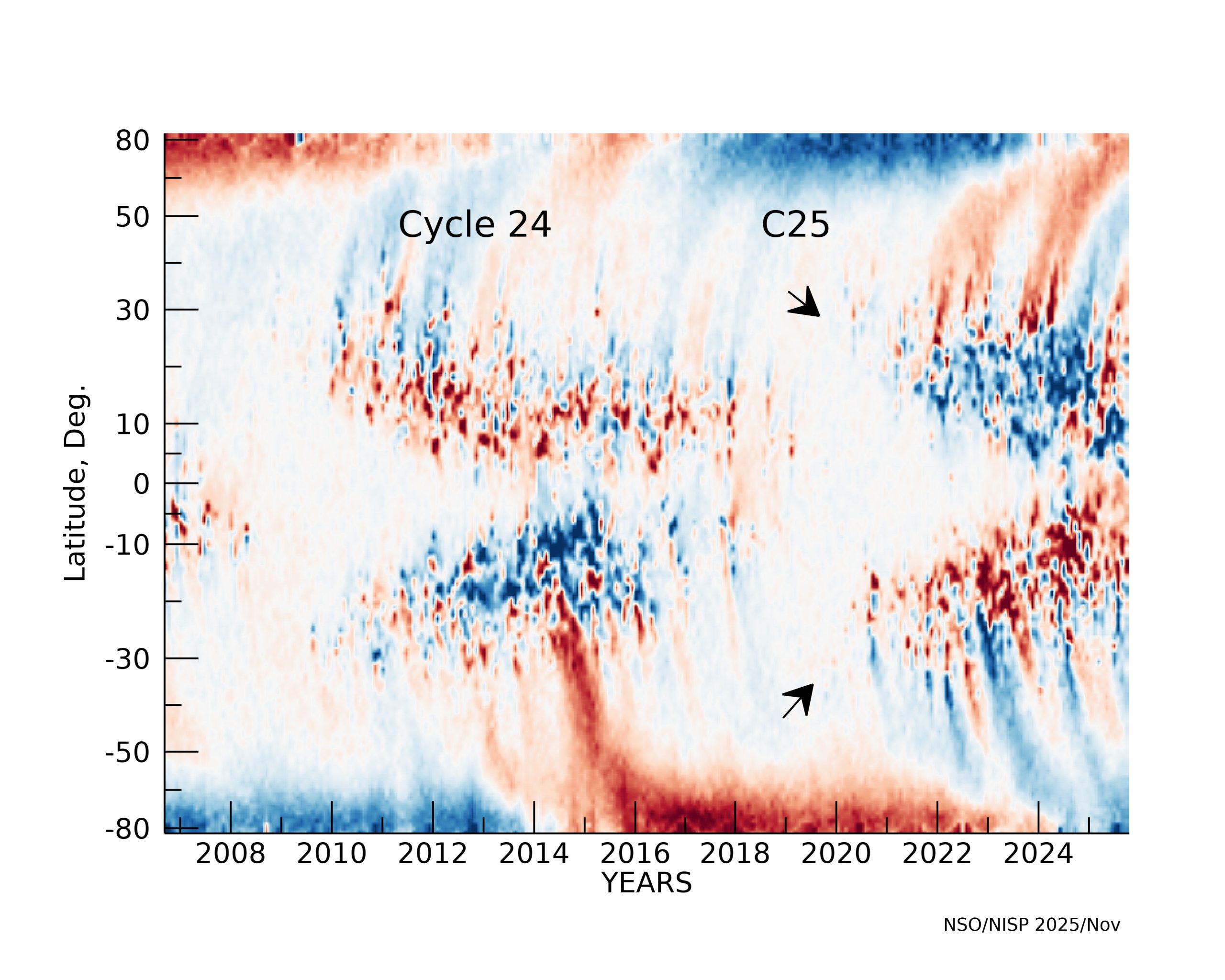 Time vs. solar latitude diagram of the radial component of the solar magnetic field (supersynoptic map or “butterfly” diagram) for Cycle 24 based on the (zero-point corrected) integer rotation synoptic maps from GONG. Blue/red show negative/positive polarity fields scaled between ±5 Gauss. Two black arrows mark approximate location of two latitudinal bands of Cycle 25. Data are acquired by GONG instruments operated by NISP/NSO/AURA/NSF.